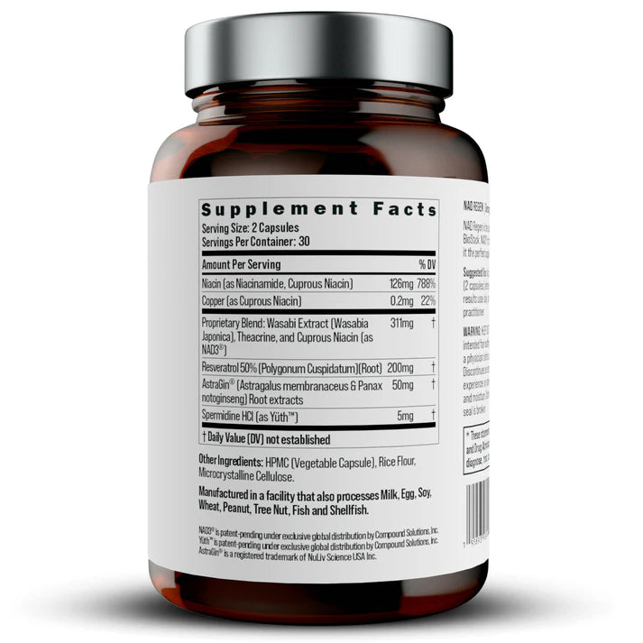 NAD3® подпомага повишаването на NAD+, активира пътища на дълголетие и намалява клетъчния стрес, свързан със стареенето.